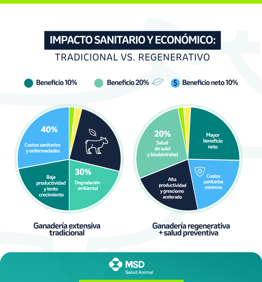 Figura 4. Comparativa de rubros de inversión: Sistema Tradicional vs. Regenerativo. Se destaca la drástica reducción del gasto en sanidad reactiva (químicos) mediante planes preventivos sistémicos. Además del control de parásitos mediante rotación (rompimiento del ciclo biológico del parásito en el pasto) liberación de recursos financieros y el aumento de la productividad por hectárea permiten un incremento superior al 800% en la producción de carne anual (kg/ha/año), fundamentado en el bienestar animal y la salud del suelo.