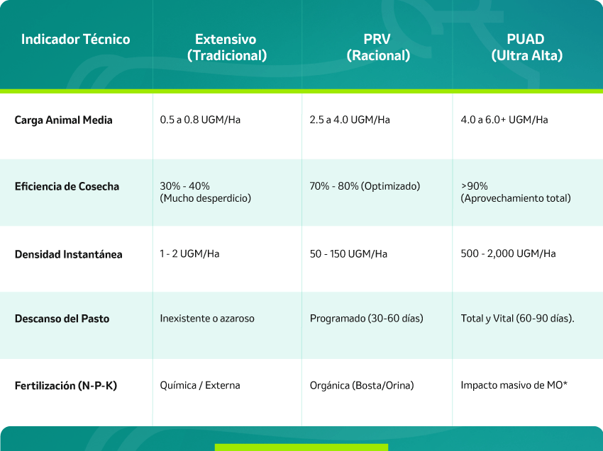 Tabla 1. Indicadores de Precisión en la Gestión de Biomasa: *UGM (Unidad Gran Ganado): Estandariza el inventario animal a un peso base de 450 kg para calcular con exactitud la demanda de forraje. Carga Animal: Mide cuántas UGM sostiene una hectárea al año; actúa como el principal multiplicador de ingresos al permitir triplicar la producción en la misma superficie. Densidad Instantánea: Representa la presión animal en un momento exacto, que alcanza niveles de 500 a 1000 UGM/ha en sistemas PUAD, para garantizar una fertilización orgánica uniforme que reduce los costos de insumos en un 60%. Es fundamental precisar que la Densidad Instantánea es, por definición, eventual y de muy corta duración, diseñada para generar un impacto biológico sin degradar el recurso. Eficiencia de Cosecha: Asegura que el aprovechamiento del pasto suba del 30% al 80%, lo que transforma el desperdicio tradicional en ganancia neta.