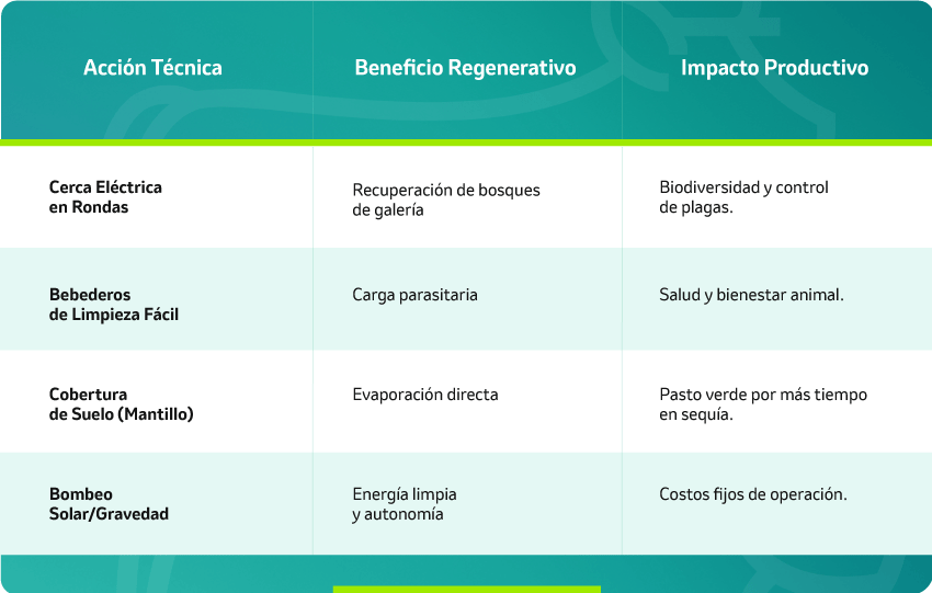 Tabla 2. Análisis comparativo de indicadores de eficiencia hídrica y ambiental. Se observa cómo la gestión hídrica regenerativa transforma el suelo en un reservorio dinámico, optimizando el balance hídrico mediante la reducción de la evaporación y la eliminación de vectores de contaminación en fuentes naturales. Este enfoque permite mayor estabilidad en la oferta forrajera durante periodos de estrés hídrico.
