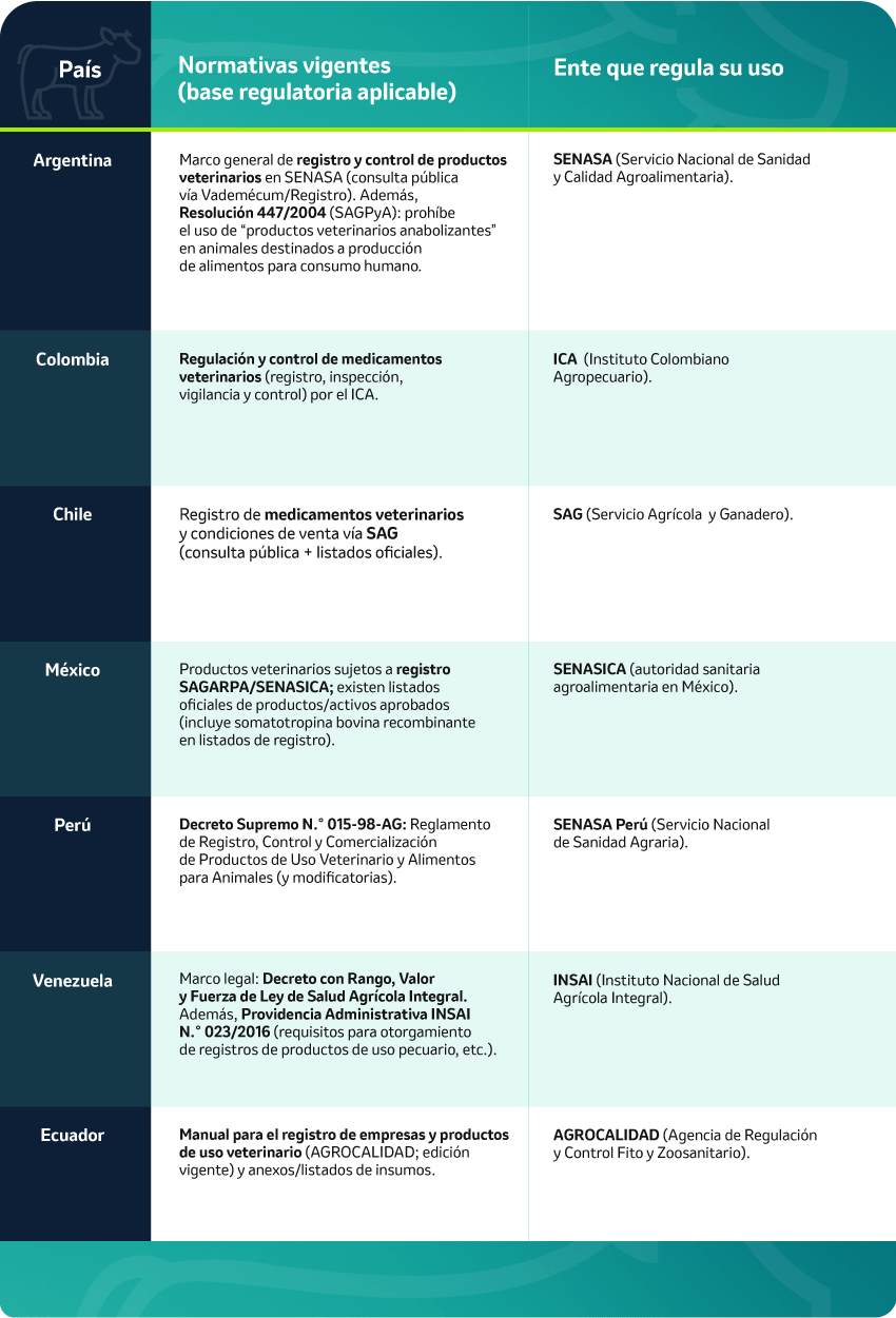 – Con la información regulatoria disponible, Colombia, México y Chile cuentan con marcos de registro operativos y autoridades sanitarias que permiten la evaluación y, en determinados casos, la autorización de la somatotropina bovina recombinante dentro de sus sistemas de control de medicamentos veterinarios. En contraste, Argentina mantiene una postura regulatoria restrictiva frente al uso de sustancias hormonales con fines productivos en animales destinados al consumo humano, enmarcada en normativas que limitan o prohíben el empleo de productos con acción anabólica, por lo que su utilización no forma parte de las prácticas autorizadas de manera general. En el caso de Perú, Venezuela y Ecuador, aunque existen normas claras para el registro, control y comercialización de medicamentos veterinarios y autoridades competentes que supervisan su uso, la autorización específica de lactotropina no se encuentra claramente documentada en la información pública disponible, por lo que su estatus debe considerarse no concluyente hasta verificar su inclusión expresa en los registros oficiales por principio activo o por producto.-