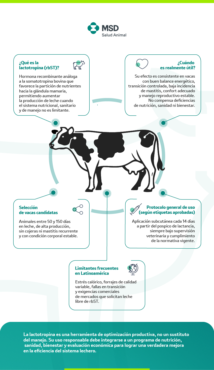 La mejora de la producción de leche en bovinos no depende de una única intervención, sino de la integración coherente entre fisiología, nutrición, manejo, sanidad, bienestar y uso racional de medicamentos. En este contexto, la lactotropina puede constituir una herramienta válida para optimizar la eficiencia productiva y la persistencia de la lactancia cuando se aplica en sistemas técnicamente estables, con adecuado consumo de materia seca, control metabólico, confort térmico y programas sanitarios sólidos, siempre bajo supervisión veterinaria y dentro de un enfoque de medicina de producción orientado a la prevención y a la sostenibilidad. [1-7]